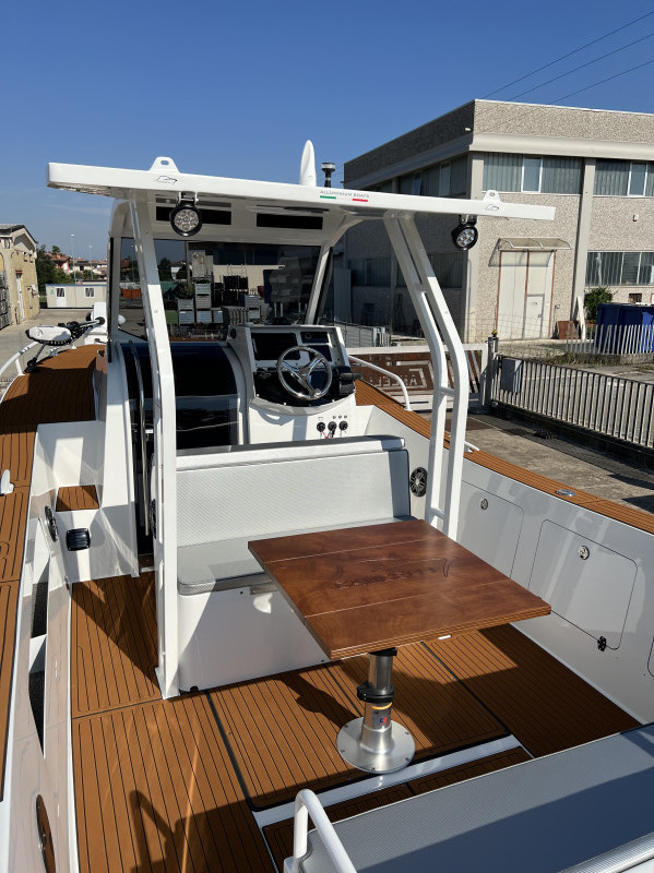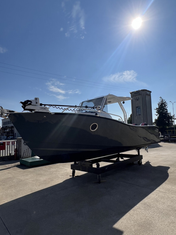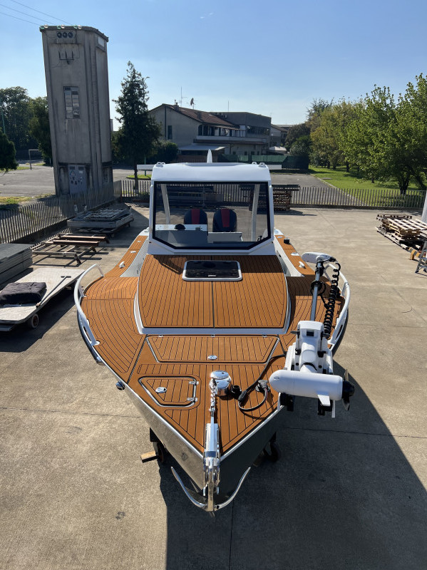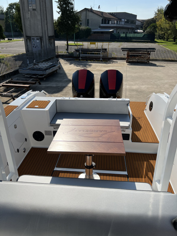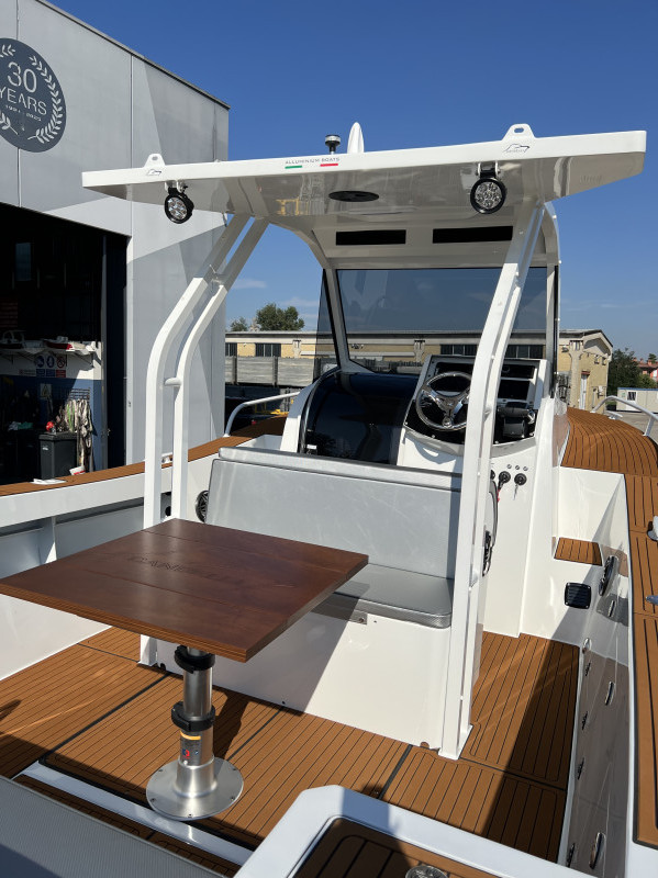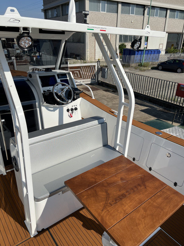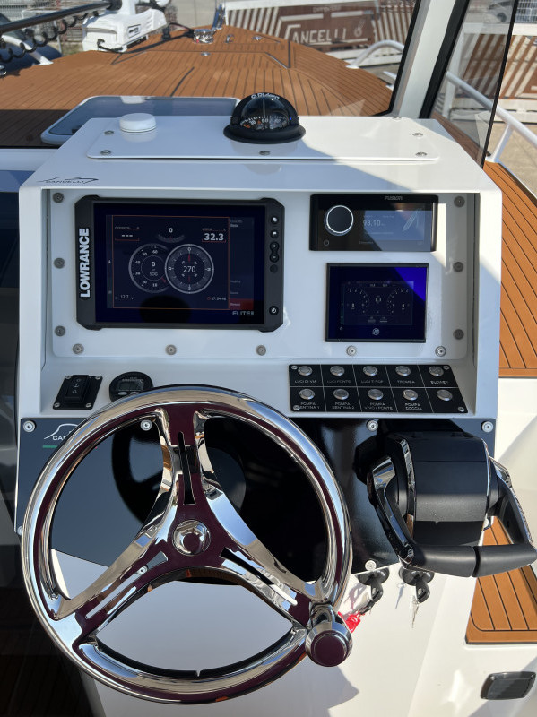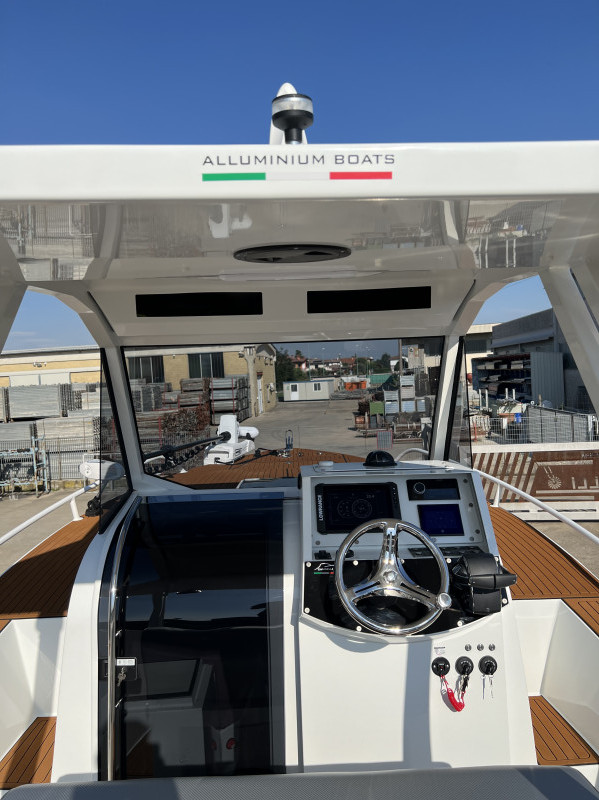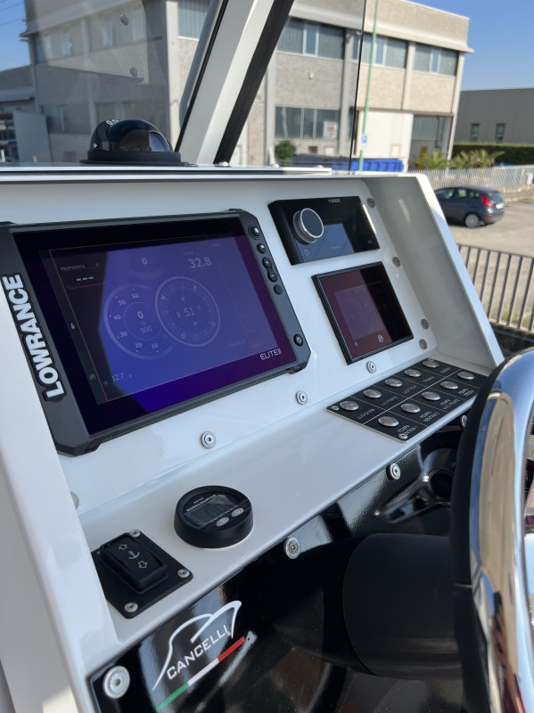 La carena è ultima evoluzione delle opere vive già collaudate con successo sugli altri scafi Akesdesign e conosciute per le doti marine: planata a bassissimo regime, scorrevolezza , morbidezza di impatto in condizioni di mare mosso e navigazione asciutta; tutte queste caratteristiche unite a un peso contenuto rendono il Cancelli 27 in grado di regalare prestazioni entusiasmanti con potenze non necessariamente notevoli, a tutto vantaggio dei consumi . Peso contenuto e scorrevolezza , obiettivi ricercati nel progetto della barca, si riflettono anche nei consumi che sono sensibilmente inferiori a quelli di una barca classica parimisura. Una carena stabile sia trasversalmente che longitudinalmente, oltrechè asciutta, consente di poter rientrare in qualsiasi condizione meteo. Ma la sicurezza è anche passiva: nonostante sia veramente difficile scalfire la spessa opera viva del Cancelli 27, poichè l' alluminio è materiale principe nella resistenza all' abrasione, il progetto dello scafo ha previsto delle possibili compartimentazioni in maniera stagna e oltre a ciò delle riserve di galleggiamento in materiale espanso , in modo da rimanere a galla anche se perforato. Oltre a doti marine e robustezza degne di questo nome, il progetto della barca è stato sviluppato con particolare attenzione al comfort di bordo e ergonomia di coperta. Niente spazi angusti, nessuna zona sprecata: due grandi plancette rendono piacevole trascorrere i momenti di sole sdraiati comodamente a poppa con i piedi ammollo, un passaggio laterale da oltre 60 cm di larghezza rende immediato l' accesso al pozzetto; la zona pranzo (e cena) è comodissima grazie ai divani contrapposti al centro dei quali si arma velocemente un tavolo di generose dimensioni che può fare anche da prolunga prendisole di poppa; il divano di poppa ospita da un lato la vasca del vivo e ha delle maniglie laterali di protezione per la massima sicurezza. Il bolster - seduta di guida centrale , anch' esso contornato tra maniglioni in grado di offrire sempre un solido appiglio, cela un gavone che può contenere il frigo o altre attrezzature e fa da seduta opposta alla marcia per sfruttare la zona pranzo o poggiareni per pilota e copilota. La consolle ha la strumentazione disposta ergonomicamente senza ricadere in grossi difetti purtroppo tipici di tante barche ovvero volante che poggia contro la pancia, troppo basso, o manetta in posizione sbagliata, fermo restando la disposizione degli strumenti di bordo che ne rende la lettura immediata. A prua si accede mediante due comodi gradini e tutta la zona del ponte racchiude la tuga con passo d' uomo sulla quale si possono disporre i cuscini per formare il prendisole di prua, il tutto incorniciato dalle maniglie laterali di sicurezza. La prora termina con lo spazio stagno nel quale trova spazio il verricello elettrico per l' ancora e la catena. Un' altra soluzione affinata e perfezionata è il tettuccio "G-top" realizzato con tubo continuo a girare sul quale è saldata una lamiera che fa , oltre che da riparo, da base per ogni tipo di strumento e luci. Attraverso una porta scorrevole e di larghezza 60 cm si accede all' interno della tuga, che cela una cabina in cui è possibile pernottare comodamente grazie all' ampio letto di lunghezza 210 cm per larghezza max 180 cm con la possibilità di bagno dedicato e lavello. La cabina è ben illuminata di giorno grazie al grande passo d' uomo e di notte grazie all' impianto luci a led a intensità regolabile; la scelta del colore e tipo dei tessuti è personalizzabile.