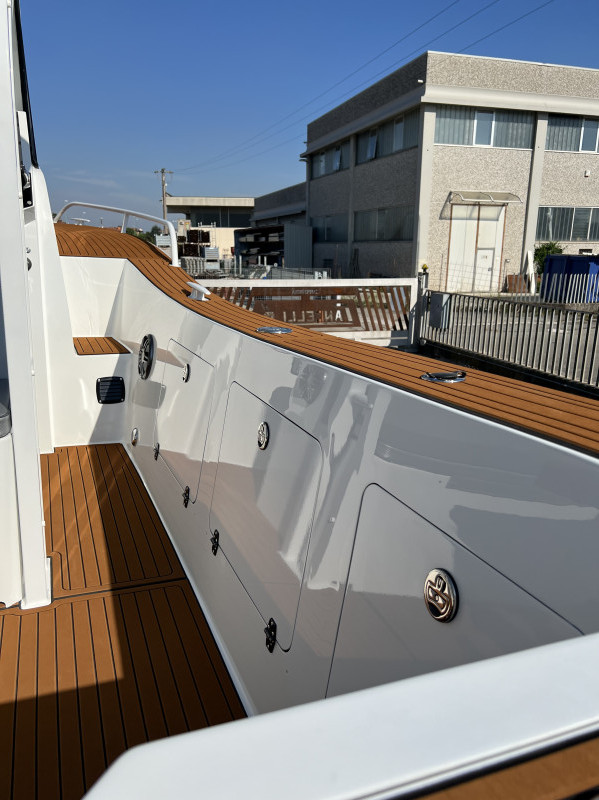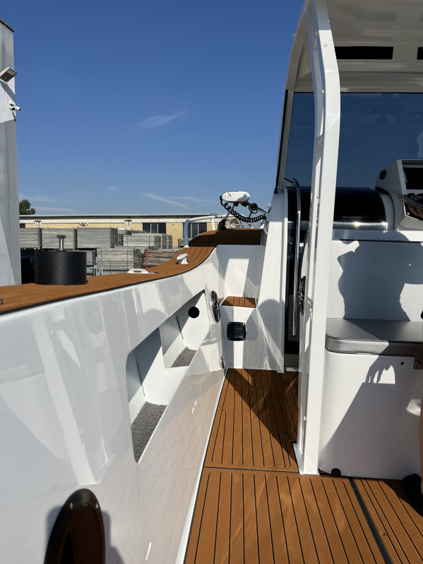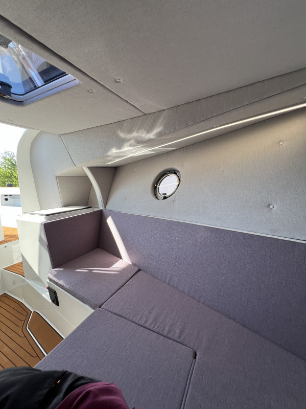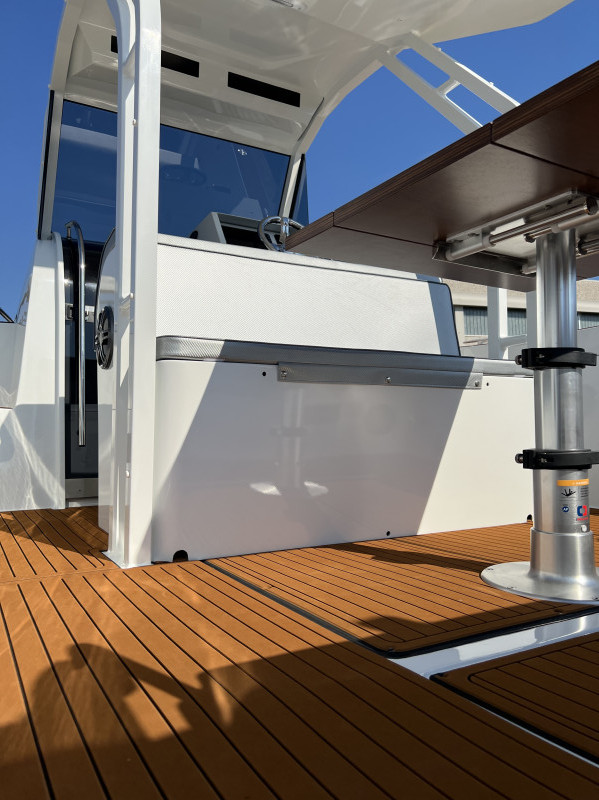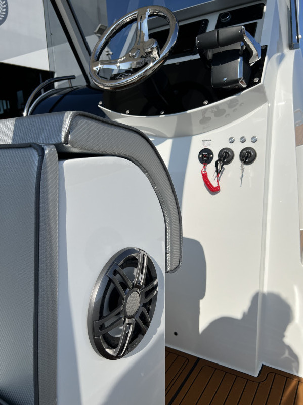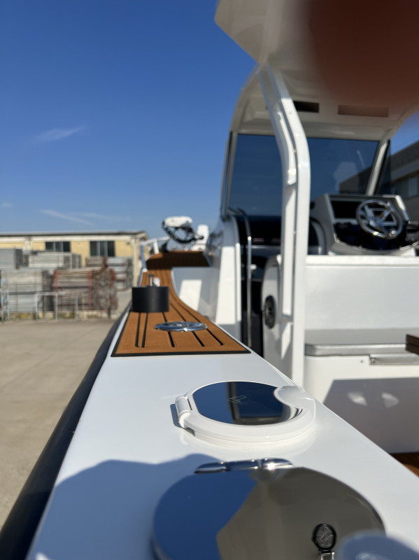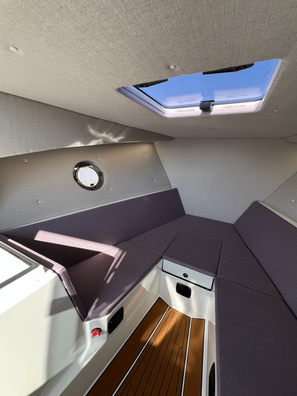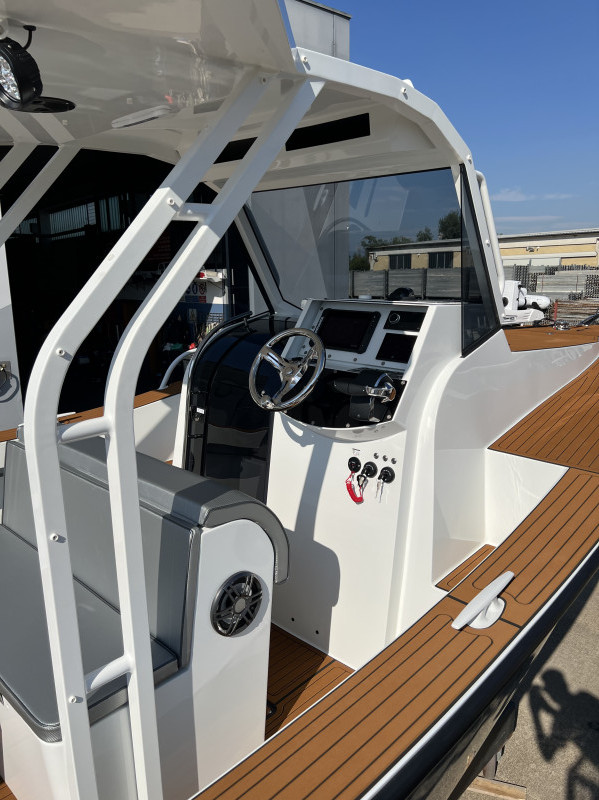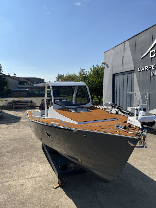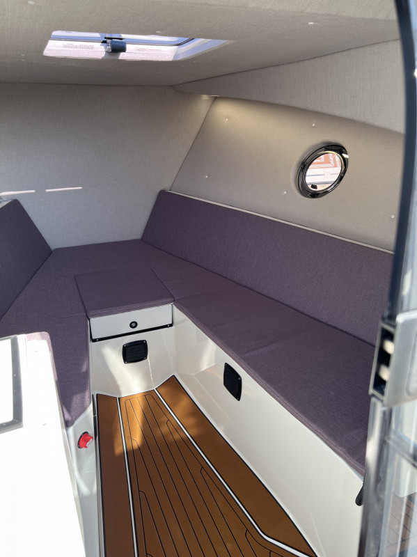 La carena è ultima evoluzione delle opere vive già collaudate con successo sugli altri scafi Akesdesign e conosciute per le doti marine: planata a bassissimo regime, scorrevolezza , morbidezza di impatto in condizioni di mare mosso e navigazione asciutta; tutte queste caratteristiche unite a un peso contenuto rendono il Cancelli 27 in grado di regalare prestazioni entusiasmanti con potenze non necessariamente notevoli, a tutto vantaggio dei consumi . Peso contenuto e scorrevolezza , obiettivi ricercati nel progetto della barca, si riflettono anche nei consumi che sono sensibilmente inferiori a quelli di una barca classica parimisura. Una carena stabile sia trasversalmente che longitudinalmente, oltrechè asciutta, consente di poter rientrare in qualsiasi condizione meteo. Ma la sicurezza è anche passiva: nonostante sia veramente difficile scalfire la spessa opera viva del Cancelli 27, poichè l' alluminio è materiale principe nella resistenza all' abrasione, il progetto dello scafo ha previsto delle possibili compartimentazioni in maniera stagna e oltre a ciò delle riserve di galleggiamento in materiale espanso , in modo da rimanere a galla anche se perforato. Oltre a doti marine e robustezza degne di questo nome, il progetto della barca è stato sviluppato con particolare attenzione al comfort di bordo e ergonomia di coperta. Niente spazi angusti, nessuna zona sprecata: due grandi plancette rendono piacevole trascorrere i momenti di sole sdraiati comodamente a poppa con i piedi ammollo, un passaggio laterale da oltre 60 cm di larghezza rende immediato l' accesso al pozzetto; la zona pranzo (e cena) è comodissima grazie ai divani contrapposti al centro dei quali si arma velocemente un tavolo di generose dimensioni che può fare anche da prolunga prendisole di poppa; il divano di poppa ospita da un lato la vasca del vivo e ha delle maniglie laterali di protezione per la massima sicurezza. Il bolster - seduta di guida centrale , anch' esso contornato tra maniglioni in grado di offrire sempre un solido appiglio, cela un gavone che può contenere il frigo o altre attrezzature e fa da seduta opposta alla marcia per sfruttare la zona pranzo o poggiareni per pilota e copilota. La consolle ha la strumentazione disposta ergonomicamente senza ricadere in grossi difetti purtroppo tipici di tante barche ovvero volante che poggia contro la pancia, troppo basso, o manetta in posizione sbagliata, fermo restando la disposizione degli strumenti di bordo che ne rende la lettura immediata. A prua si accede mediante due comodi gradini e tutta la zona del ponte racchiude la tuga con passo d' uomo sulla quale si possono disporre i cuscini per formare il prendisole di prua, il tutto incorniciato dalle maniglie laterali di sicurezza. La prora termina con lo spazio stagno nel quale trova spazio il verricello elettrico per l' ancora e la catena. Un' altra soluzione affinata e perfezionata è il tettuccio "G-top" realizzato con tubo continuo a girare sul quale è saldata una lamiera che fa , oltre che da riparo, da base per ogni tipo di strumento e luci. Attraverso una porta scorrevole e di larghezza 60 cm si accede all' interno della tuga, che cela una cabina in cui è possibile pernottare comodamente grazie all' ampio letto di lunghezza 210 cm per larghezza max 180 cm con la possibilità di bagno dedicato e lavello. La cabina è ben illuminata di giorno grazie al grande passo d' uomo e di notte grazie all' impianto luci a led a intensità regolabile; la scelta del colore e tipo dei tessuti è personalizzabile.
